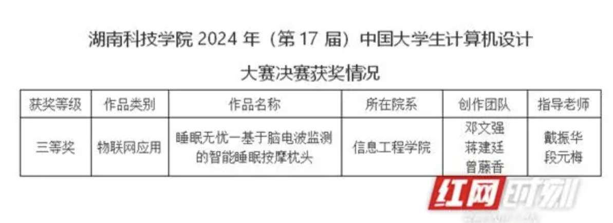 红网时刻新闻9月24日讯(通讯员 张彬 黄紫黎 向薛峰)近日,2024年(第17届)中国大学生计算机设计大赛在厦门举行。经过激烈角逐,beat365中文官方网站信息工程学院学生邓文强、蒋建廷、曾藤香的参赛作品《睡眠无忧—基于脑电波监测的智能睡眠按摩枕头》荣获全国三等奖。