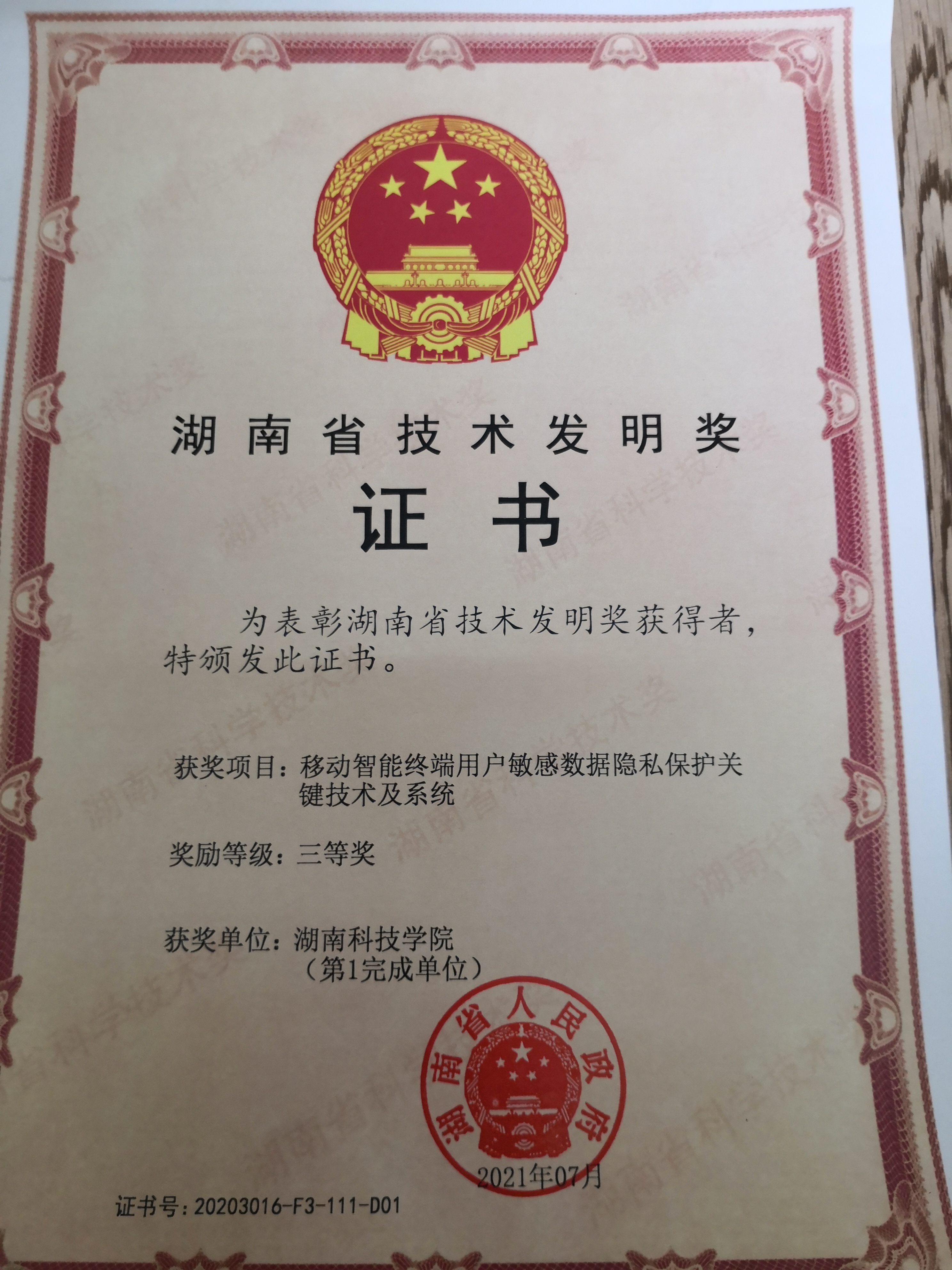 本网讯(通讯员 颜叶娟) 7月21日上午,湖南省科技创新奖励大会在长沙召开。会议表彰了2020年度湖南省科学技术奖励(含光召科技奖),beat365中文官方网站作为第一单位有4项项目获奖。其中我院教授罗恩韬主持的“移动智能终端用户敏感数据隐私保护关键技术及系统”获湖南省技术发明奖三等奖。