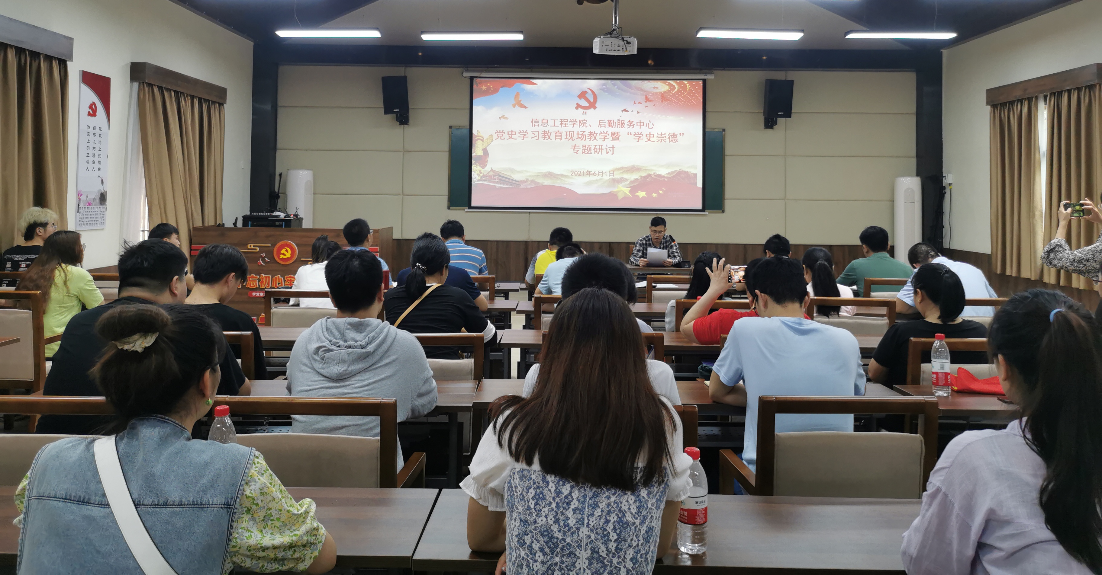 在专题学习环节,党总支书记谢一民领学《中国共产党100年:从“中国之制”到“中国之治”》等学习篇目。随后,大家围绕“学史崇德”展开专题研讨,教师党员陈婉云和学生党员袁家宝分别作为研讨代表发言。
