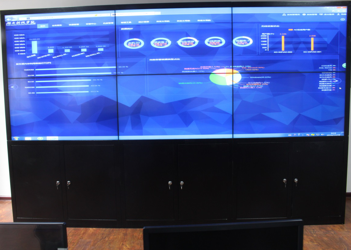 校园网第三阶段增设了监控中心,适用于各类技术交流、技术研讨、小规模讲座、培训及校园网的设备状态监控。监控中心采用六块