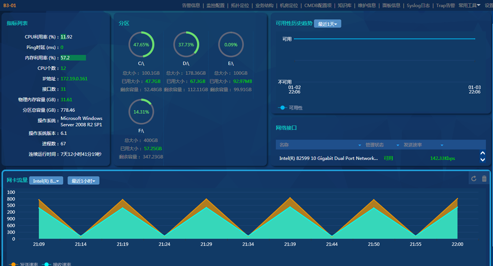 (1)设备监控平台RIILBMC。RIIL-BMC IT运维管理系统对各类设备和系统进行统一监控管理,对产生的事件形成有效的告警信息,结合RMC自动生成故障处理工单,通过APP或短信发送给管理人员,可在管理系统对故障进行定位处理,并设立了工单跟进、反馈处理机制。由此,管理人员可实时掌握网络设备的运行状态,为教学、科研提供方便。