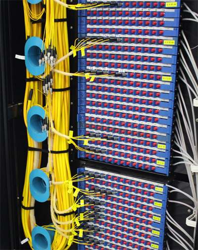 (1)交换中心光纤墙及固线。由五组配线机柜及开放式十子结构桥架组成,可实现校内任意接入机房到核心设备之间的业务线路跳接。