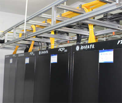 (2)机柜布局及走线。采用华为模块化机房组建数据中心,集成机柜、制冷、配电、管理等子系统,更节能环保;交换中心配置了一组光纤配线柜和两组网络设备柜,分列连体安装,一体化管理;全机房安装开放式桥架进行上走线并分层固定。
