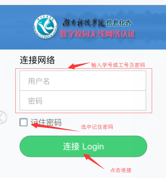 (3)打开浏览器自动弹出认证界面,点击“记住密码”和“自动连接”(下次打开浏览器点任一链接,自动登录不用再输入用户名和密码),输入用户名和密码点“登录”,如图2.3所示: