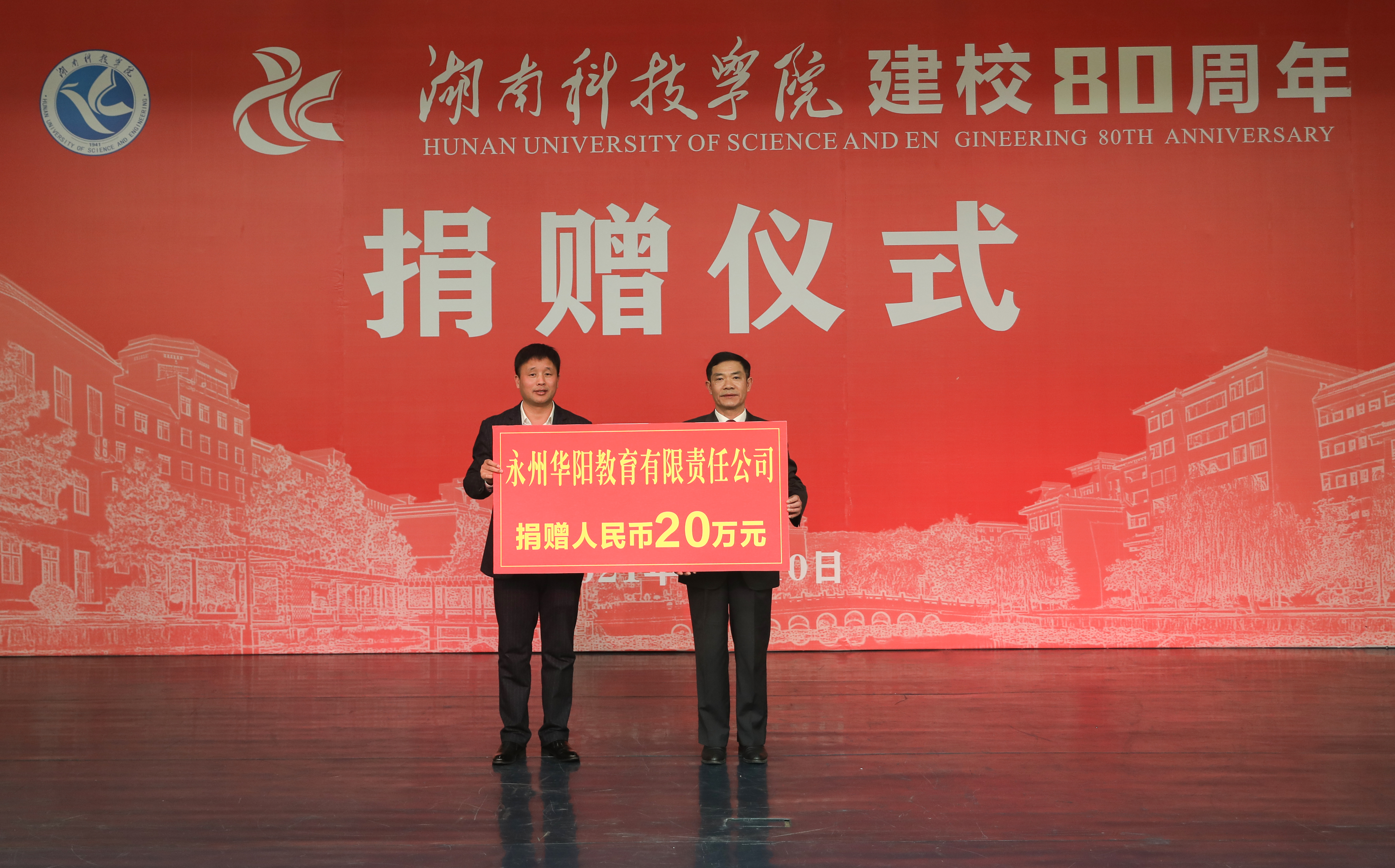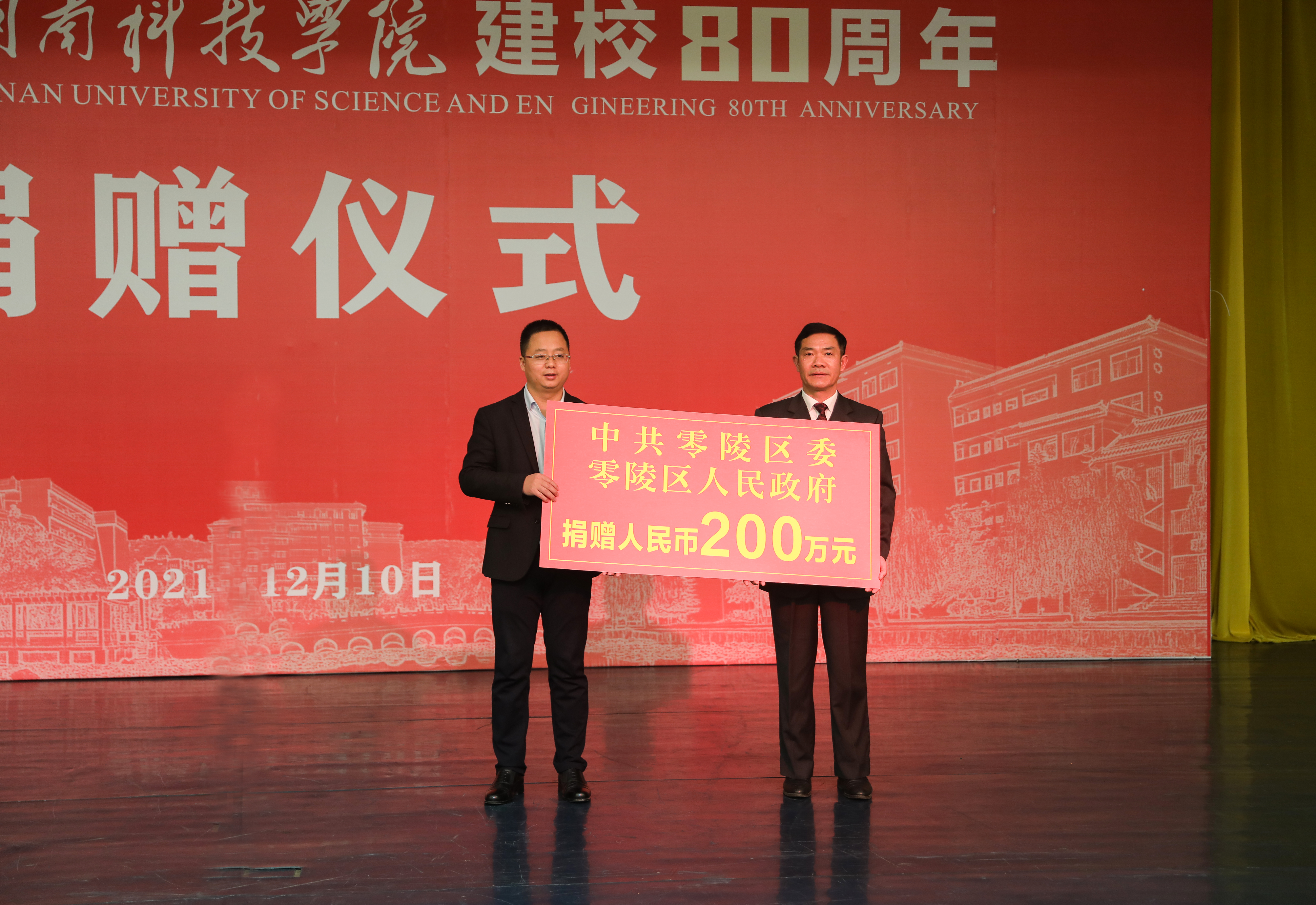 本网讯(记者 唐敏杰)12月10日下午,beat365官网举行建校八十周年捐赠仪式,地方政府、社会组织和友好人士及校友为学校捐赠物资和现金。零陵区委副书记、区长龙亮,冷水滩区委副书记、区长李辉等地方政府代表,永州科隆房地产开发有限公司负责人周祖钦、永州华阳教育有限责任公司董事长唐湘旗等社会组织和友好人士代表,化学80届张亚红、中文86届贺定中等校友代表,学校党委副书记、校长李钢,党委副书记宋宏福,党委委员、副校长吴小林,副校长郑银芳出席仪式。仪式由宋宏福主持。