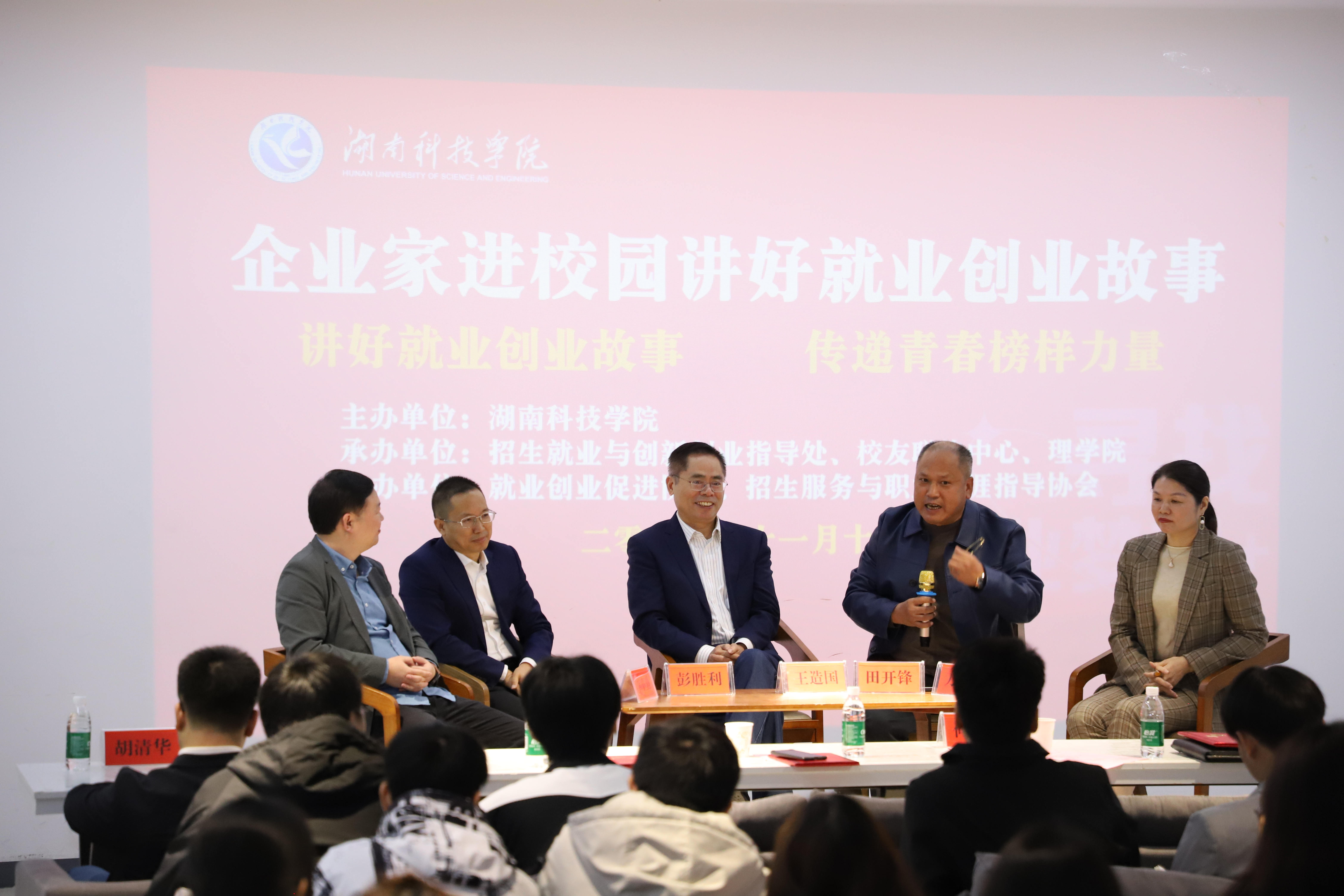 本次座谈会邀请到原物理1983届校友、杭州普惠通信设备有限公司总经理王造国,原数学1989届校友、张家界万众实业集团有限公司董事长田开锋,原数学系1997届校友、上海富彭展览展示有限公司总经理彭胜利,原数学1997届校友、杭州先秦传媒有限公司董事长万天慧,原英语2001届校友、上海喆学网络科技CEO李小勇等五位优秀创业校友分享自身的就业创业经历与经验,并结合自身经历,深入浅出地讲解大学生如何实现自我价值,鼓励学生们勇敢追求就业创业梦想,传递榜样力量。