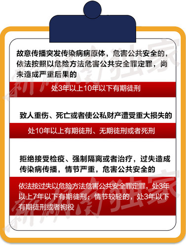 李宇先还举例说,如果被确诊为“新冠”或者疑似“新冠”者拒绝接受检疫、强制隔离或者治疗的,必须承担刑事责任。“依据《最高人民法院 最高人民检察院关于办理妨害预防、控制突发传染病疫情等灾害的刑事案件具体应用法律若干问题的解释》规定,故意传播突发传染病病原体,危害公共安全的,依法按照以危险方法危害公共安全罪定罪,尚未造成严重后果的,处3年以上10年以下有期徒刑;致人重伤、死亡或者使公私财产遭受重大损失的,处10年以上有期徒刑、无期徒刑或者死刑。如果因为这个群体拒绝接受检疫、强制隔离或者治疗,过失造成传染病传播,情节严重,危害公共安全的,依法按过失以危险方法危害公共安全罪定罪,处3年以上7年以下有期徒刑;情节较轻的,处3年以下有期徒刑或者拘役。”