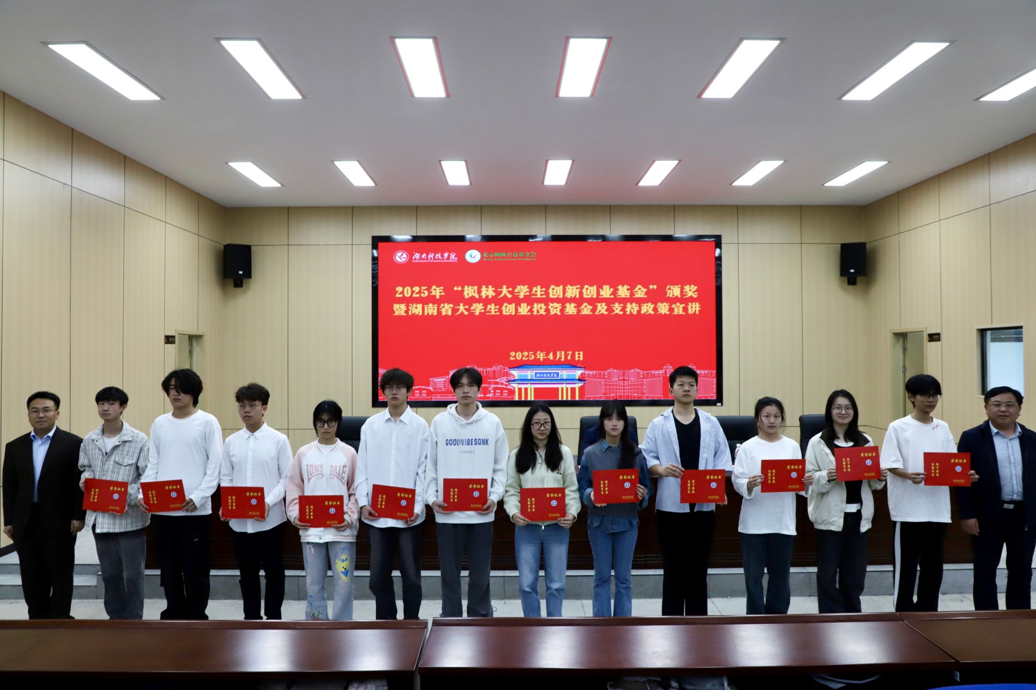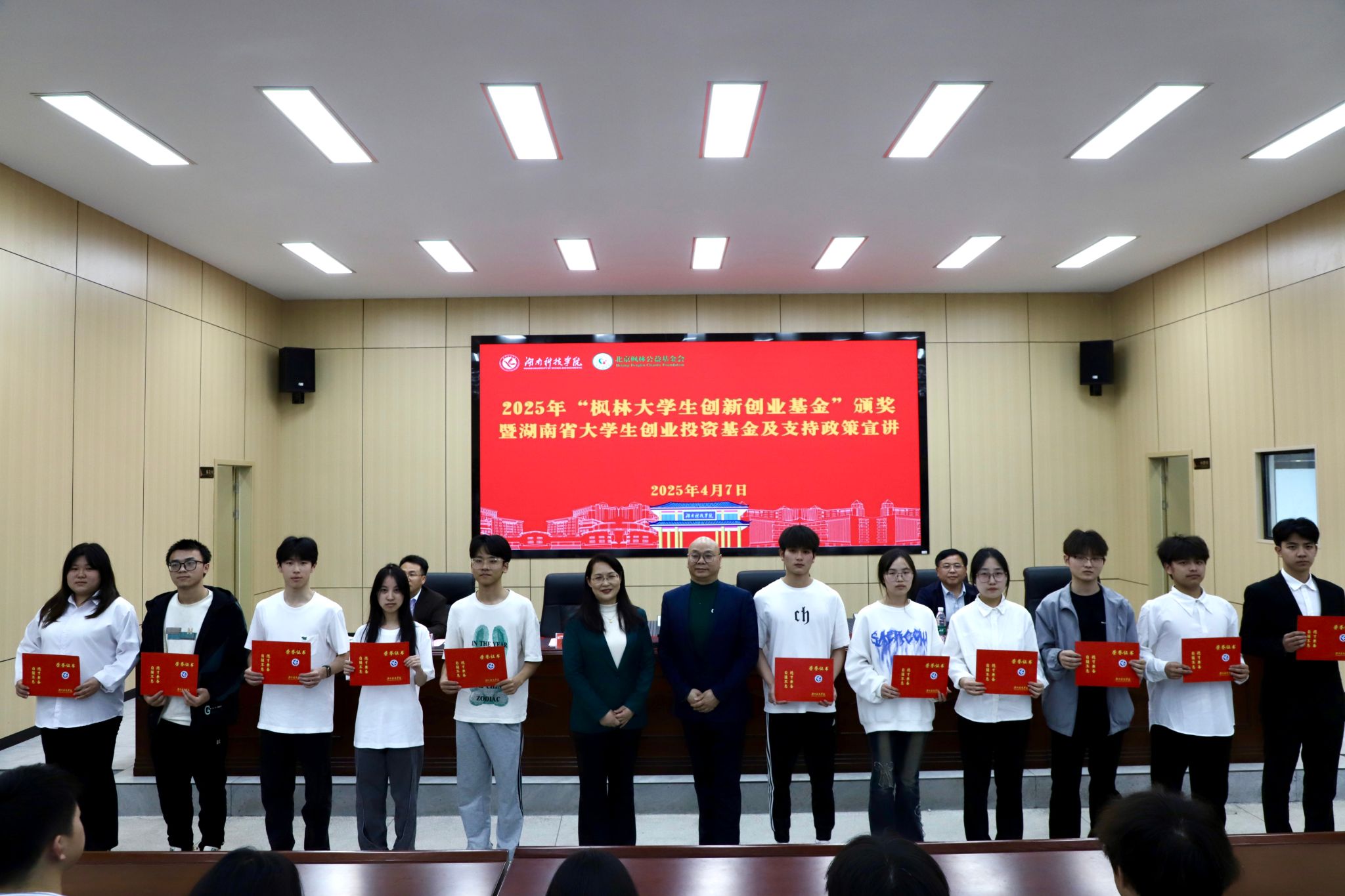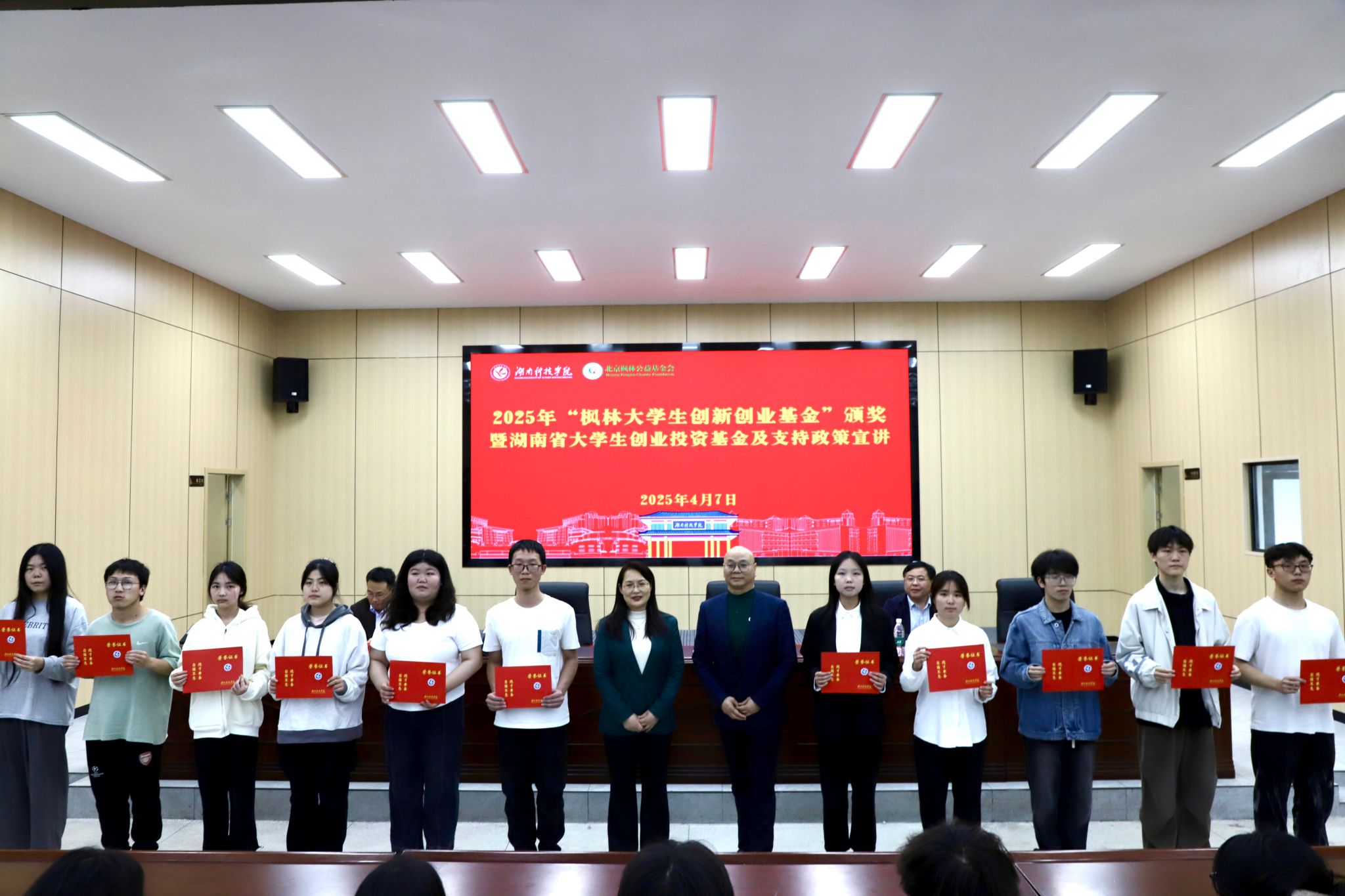 本网讯(记者 刘斌 唐晶 摄影 潘加)4月7日,2025年“枫林大学生创新创业基金”颁奖仪式暨湖南省大学生创业投资基金及支持政策宣讲活动在beat365官网举行。beat365官网77级校友、北京枫林公益基金会会长张亚红,副校长郑银芳出席活动,34个获基金资助的学生创业项目负责人、指导老师代表以及相关工作人员参加。